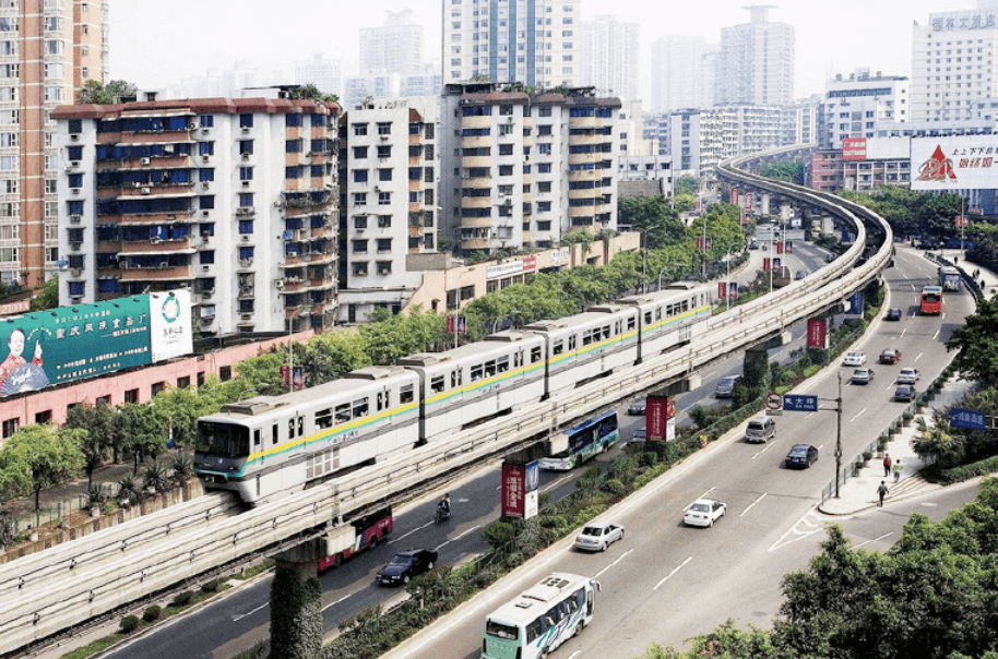 跨座式單軌是一種軌道梁承重并導(dǎo)向的型式,車輛采用橡膠車輪跨行于梁軌合一的軌道梁上,除走行輪外,在轉(zhuǎn)向架的兩側(cè)尚有導(dǎo)向輪和穩(wěn)定輪,夾行于軌道梁的兩側(cè),保證車輛沿軌道安全平穩(wěn)地行駛。跨座式單軌具有鋪設(shè)靈活(轉(zhuǎn)彎半徑小)、噪聲較小、造價(jià)適中等優(yōu)點(diǎn)。但是,因?yàn)樾枰茉O(shè)高空軌道,跨座式單軌的建設(shè)成本與建設(shè)周期相對較長。