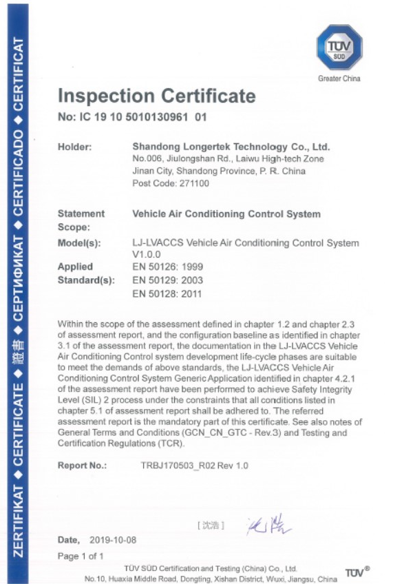 此次SIL2認證工作的開展在國內軌道空調企業尚屬首次,其順利通過是山東朗進科技股份有限公司軌道空調產品功能安全可靠性的又一權威證明,奠定了公司在軌道空調行業中的領先地位,同時也為公司后續提供更加安全成熟可靠的空調產品提供了保障。