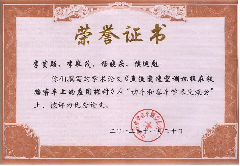 在中國鐵道學會車輛委員會動車、客車學術交流會優(yōu)秀論文評選活動中,我公司《直流變速空調機組在鐵路客車上的應用探討》被評選為優(yōu)秀論文.