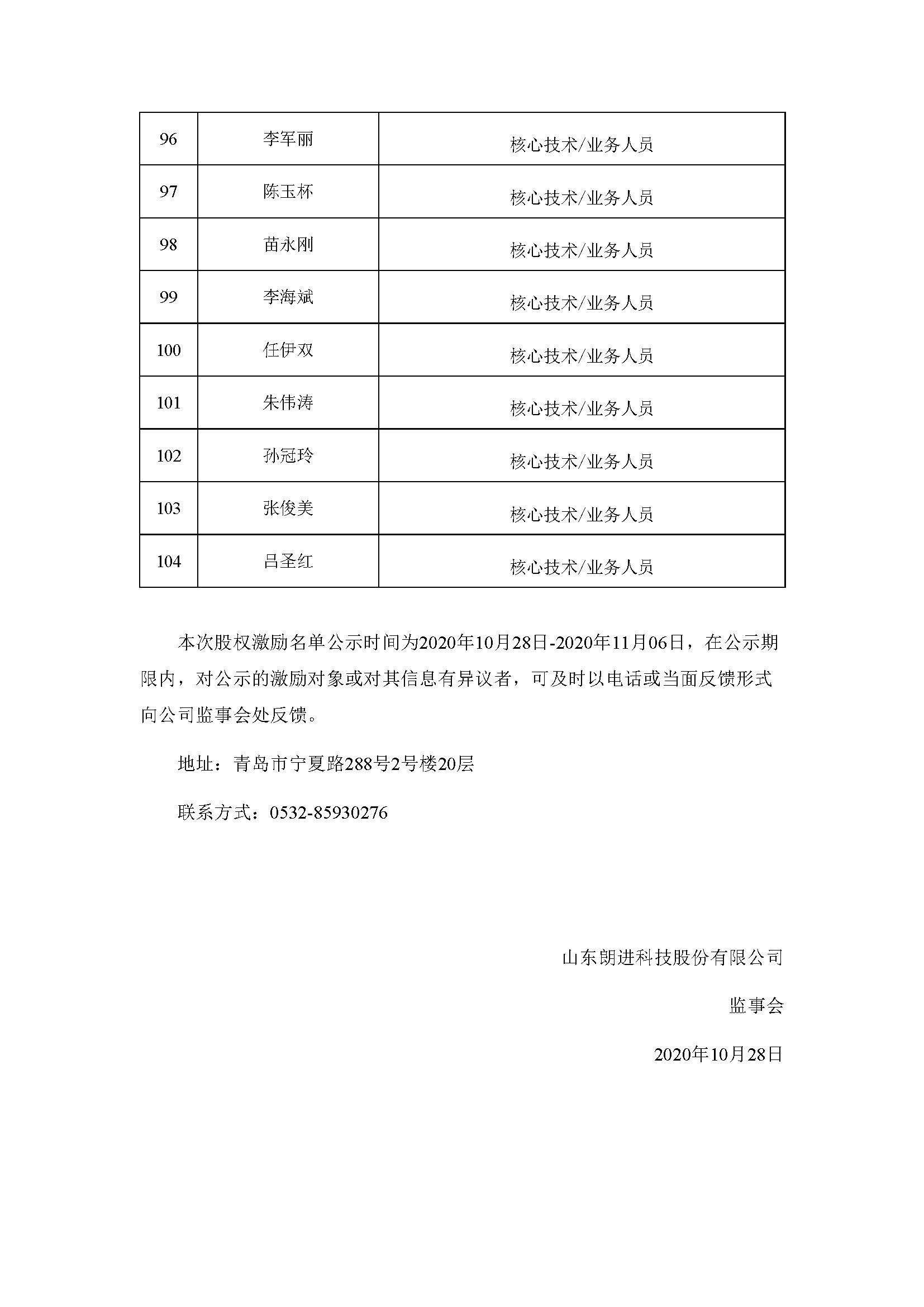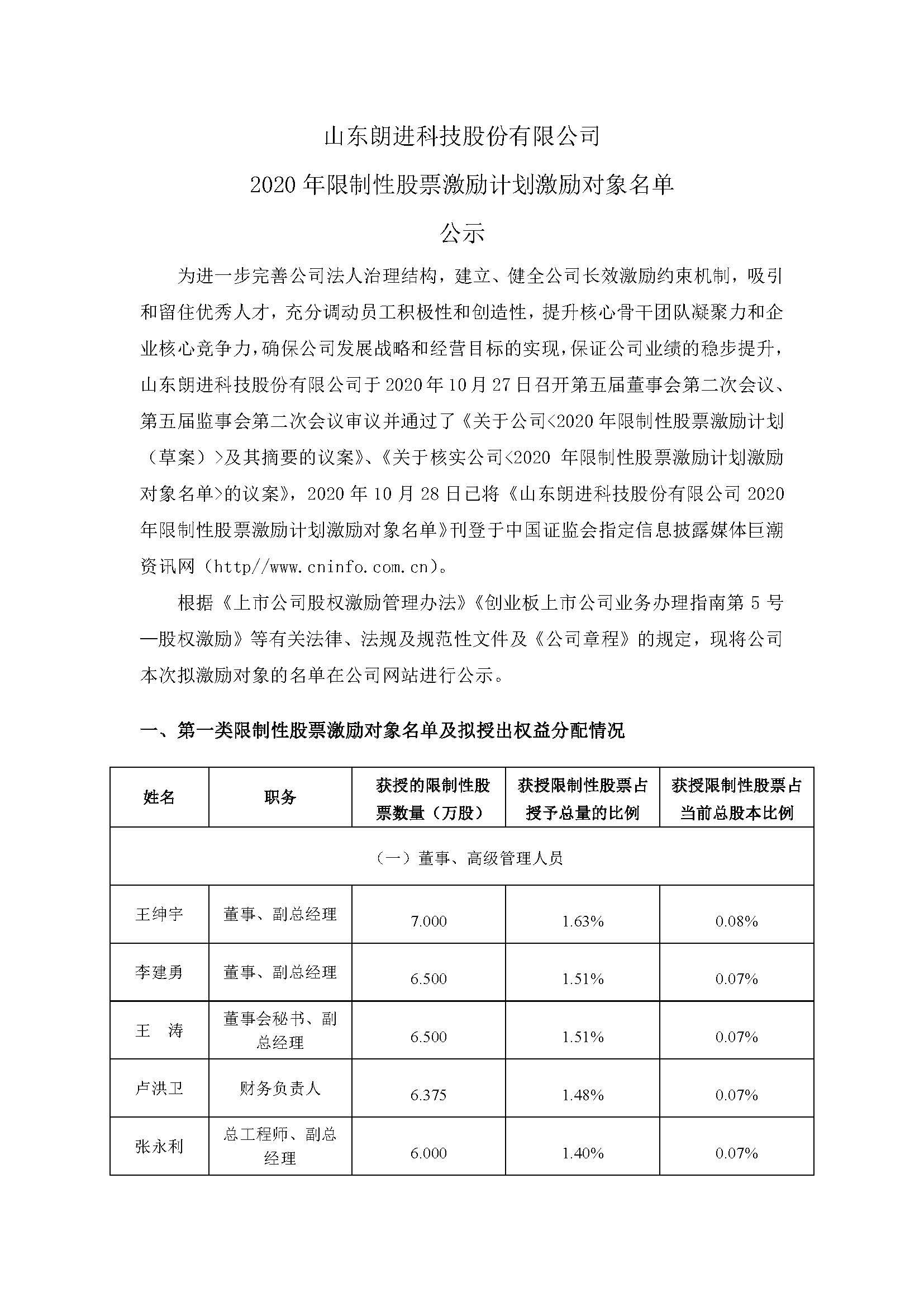 山東朗進科技股份有限公司2020年限制性股票激勵計劃激勵對象名單公示 2020-10-27