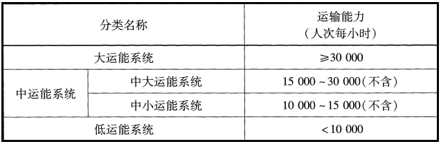 城市軌道交通按照運(yùn)輸能力劃分為大運(yùn)能系統(tǒng)、中運(yùn)能系統(tǒng)和低運(yùn)能系統(tǒng)三類,其中,中運(yùn)能系統(tǒng)細(xì)分為中大運(yùn)能系統(tǒng)和中小運(yùn)能系統(tǒng)。各分類的運(yùn)輸能力指標(biāo)見下表: