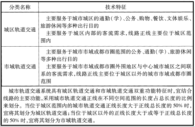 城市軌道交通按照空間范圍劃分為城區(qū)軌道交通和市域軌道交通兩類。各分類的技術(shù)特征見下表: