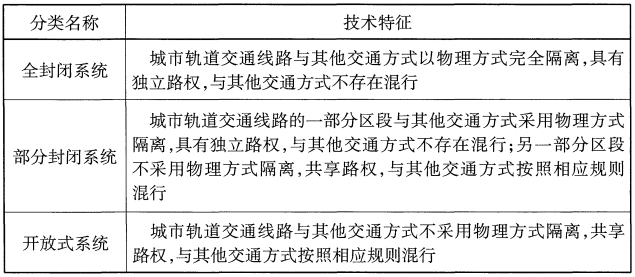 城市軌道交通按照路權(quán)形式劃分為全封閉系統(tǒng)、部分封閉系統(tǒng)和開放式系統(tǒng)三類。各分類的技術(shù)特征見下表: