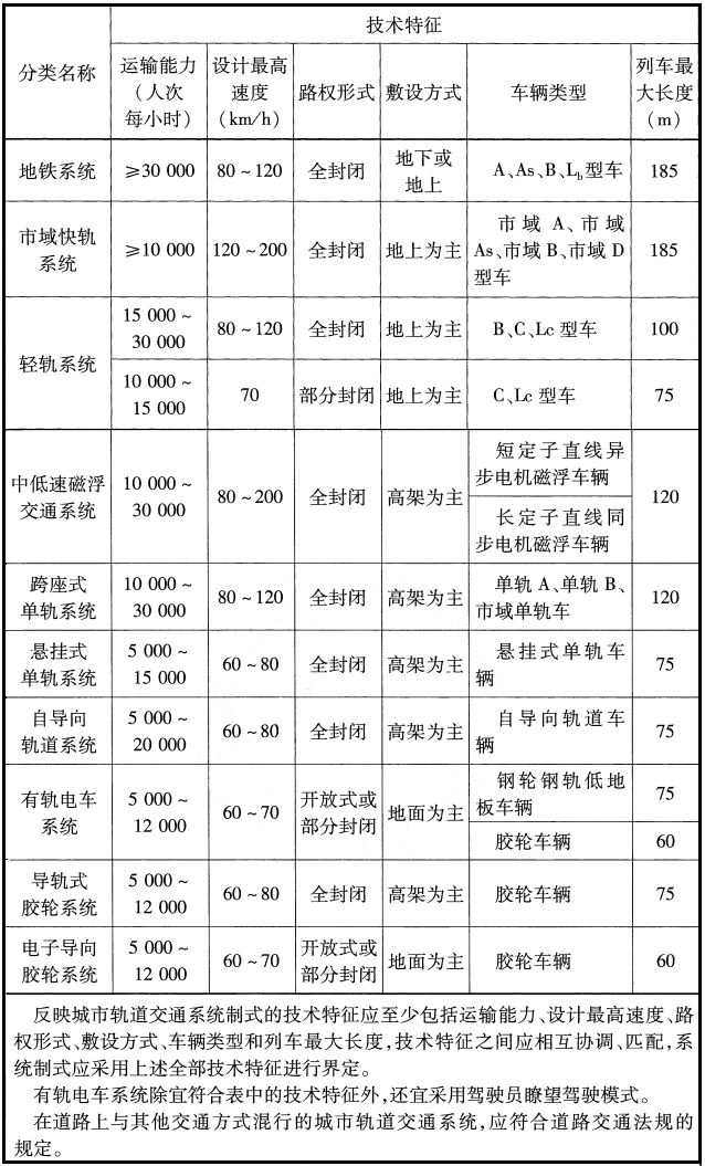 城市軌道交通按照系統(tǒng)制式劃分為地鐵系統(tǒng)、市域快軌系統(tǒng)、輕軌系統(tǒng)、中低速磁浮交通系統(tǒng)、跨座式單軌系統(tǒng)、懸掛式單軌系統(tǒng)、自導(dǎo)向軌道系統(tǒng)、有軌電車系統(tǒng)、導(dǎo)軌式膠輪系統(tǒng)、電子導(dǎo)向膠輪系統(tǒng)十類,各分類的技術(shù)特征見下表: