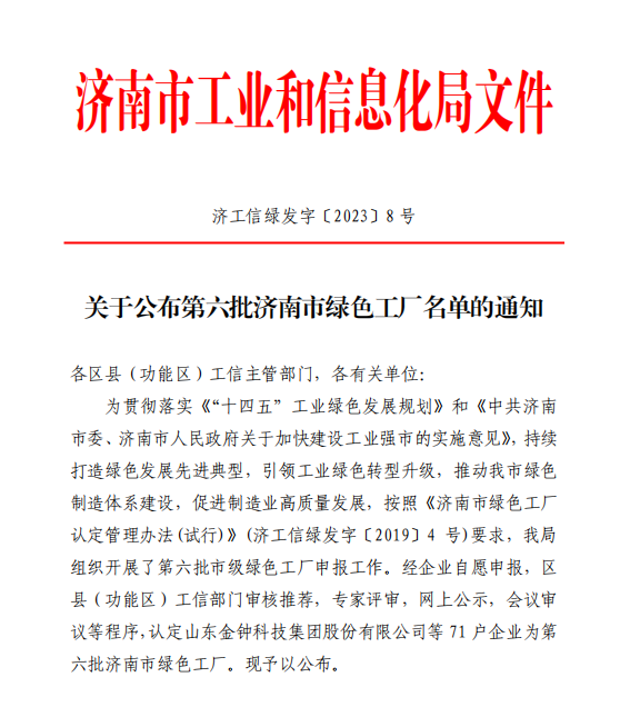 為貫徹落實(shí)《“十四五”工業(yè)綠色發(fā)展規(guī)劃》和《中共濟(jì)南 市委、濟(jì)南市人民政府關(guān)于加快建設(shè)工業(yè)強(qiáng)市的實(shí)施意見》,持續(xù) 打造綠色發(fā)展先進(jìn)典型,引領(lǐng)工業(yè)綠色轉(zhuǎn)型升級(jí),推動(dòng)濟(jì)南市綠色制造體系建設(shè),促進(jìn)制造業(yè)高質(zhì)量發(fā)展,按照《濟(jì)南市綠色工廠認(rèn)定管理辦法(試行)》(濟(jì)工信綠發(fā)字〔2019〕4 號(hào))要求,濟(jì)南市工信局組織開展了第六批市級(jí)綠色工廠申報(bào)工作。